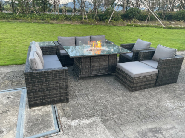 This classic 9-seater casual Rattan Fire Pit Dining Table Dining Table Sofa set seats 9 with a comfortable soft cushion back and is made from new premium dark grey rattan to withstand the wind, rain and sunny weather in the UK. The cushions are of high quality, extra thick with washable covers.